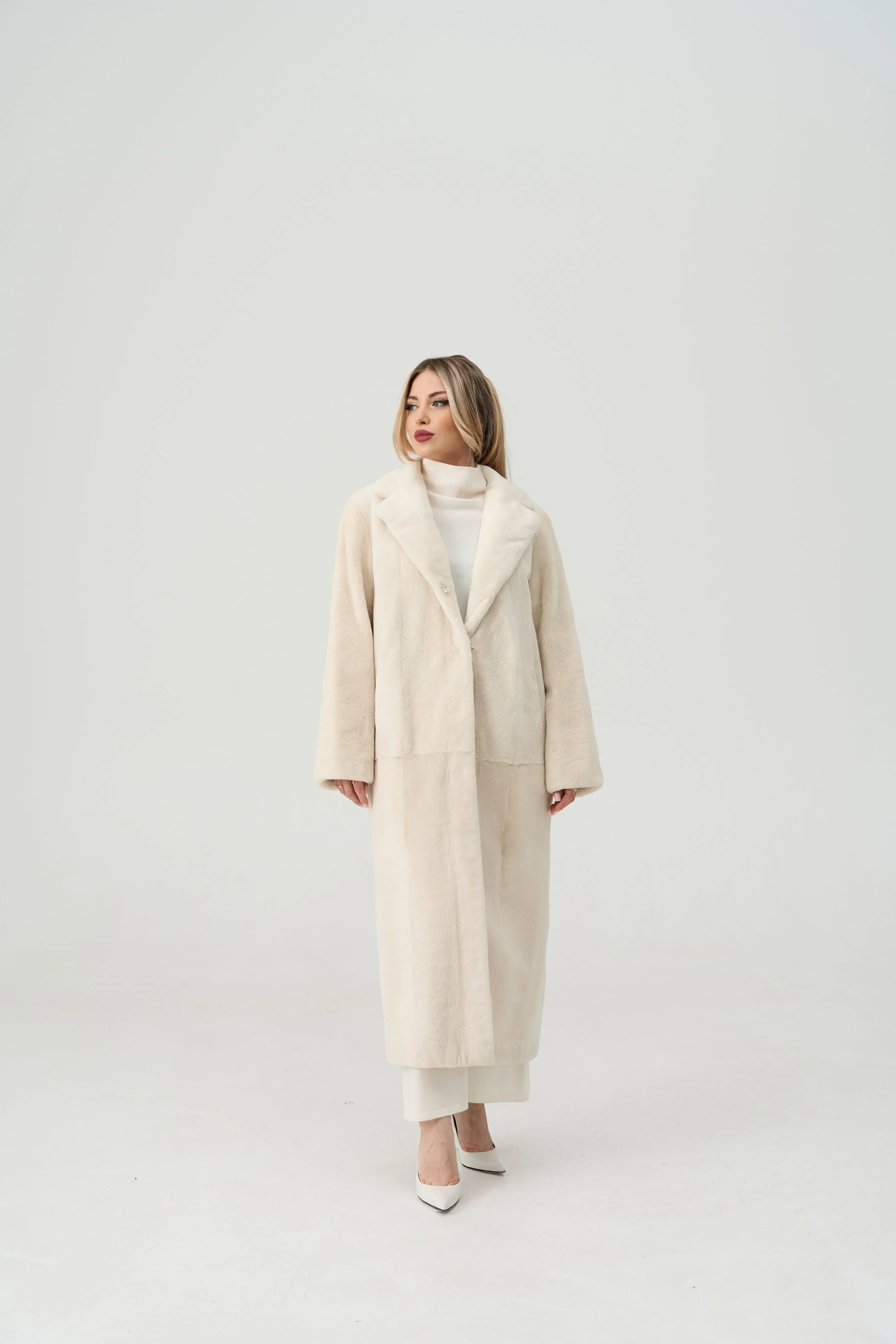 Шуба из стриженной норки с манишкой молочного оттенка