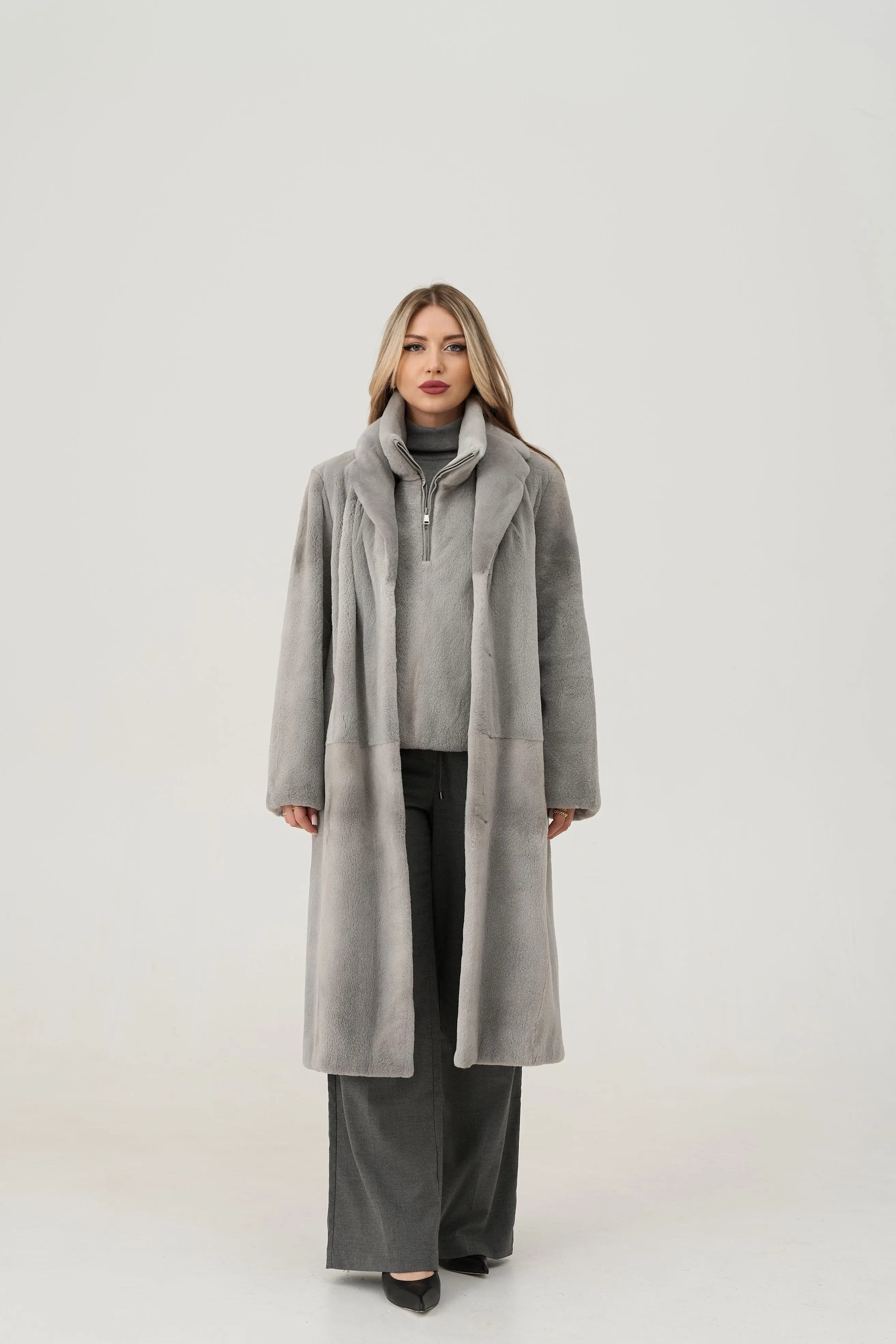 Шуба из стриженной норки с манишкой светло-серого оттенка