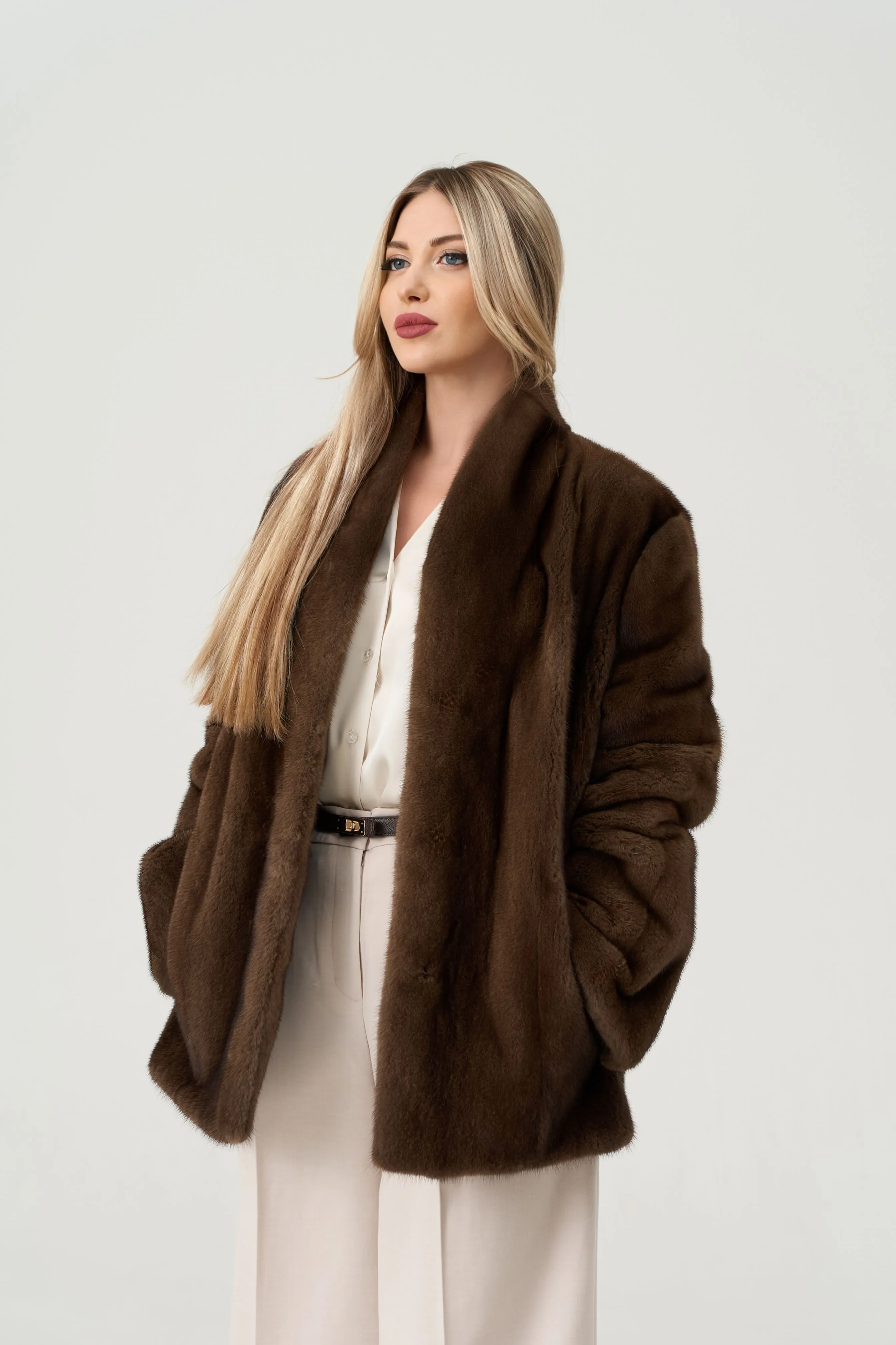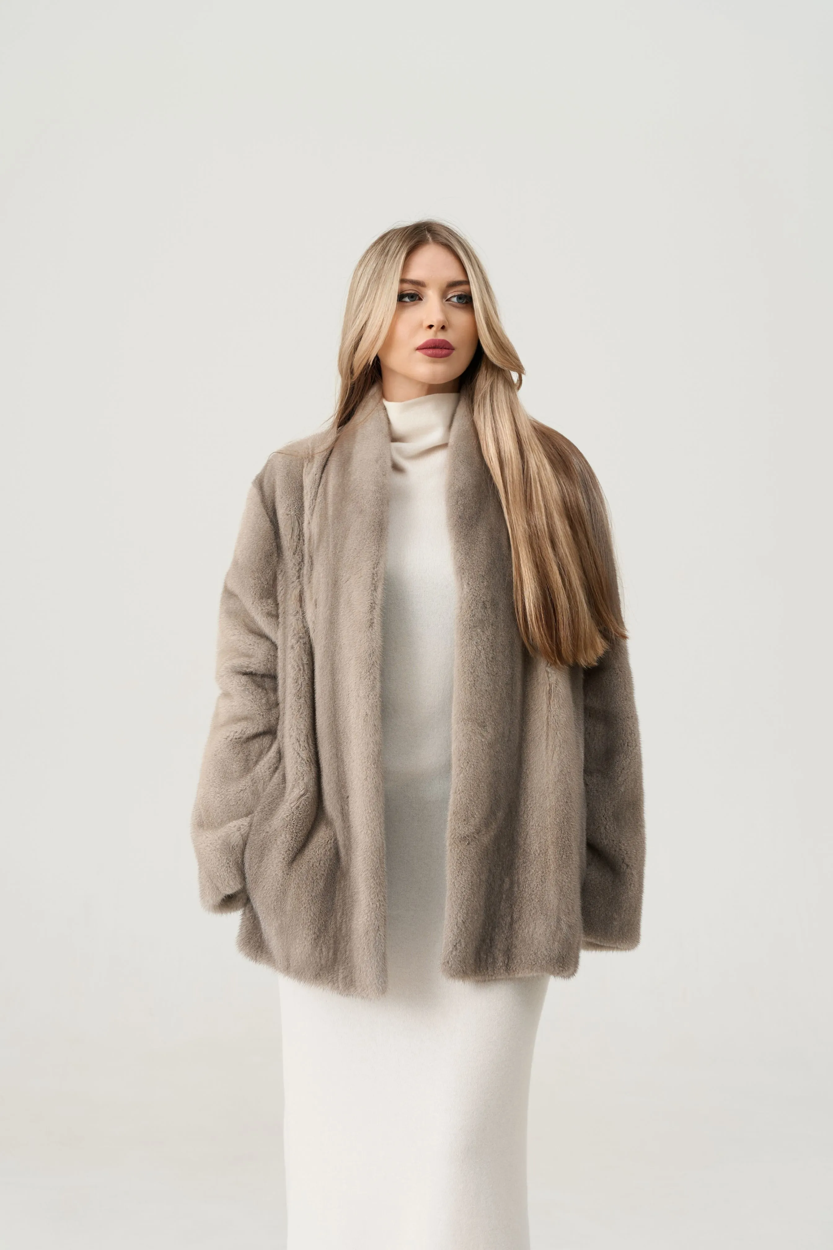 Шуба из стриженной норки с манишкой светло-серого оттенка