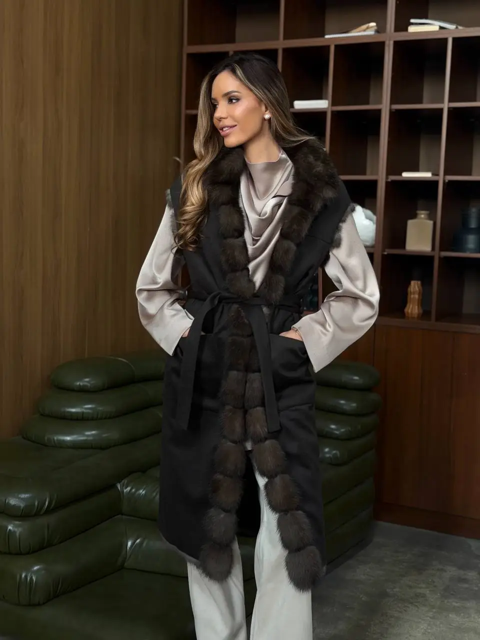 Объемная шуба миди длины из натурального меха соболя в выразительном ореховом цвете. Свободный крой и мягкий шалевый воротник придают образу легкость и естественную элегантность. Благодаря тонкой выделке мех остается лёгким, но отлично сохраняет тепло даже в морозную погоду. Универсальная длина и продуманный силуэт позволяют сочетать эту модель как с повседневной одеждой, так и с вечерними образами. Без лишних акцентов — только фактура, цвет и качество, которые говорят сами за себя.